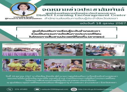 วันที่ 18 ตุลาคม 2567 นางโสเพ็ญ ย้อยอัด ผู้อำนวยการศูนย์ส่งเสริมการเรียนรู้ระดับอำเภอสะเดา มอบหมายให้นายรักอรัญ คงนวลใย ครูกศน.ตำบล ร่วมเป็นกรรมการตัดสินการประกวดตีโพน ในโครงการสืบสานประเพณีท้องถิ่น (ลากพระ) ประจำปี2567 ณ ศูนย์พัฒนาคุณภาพชีวิตและส่งเสร