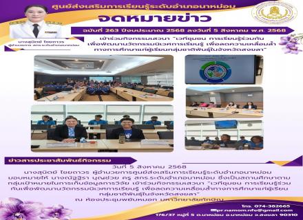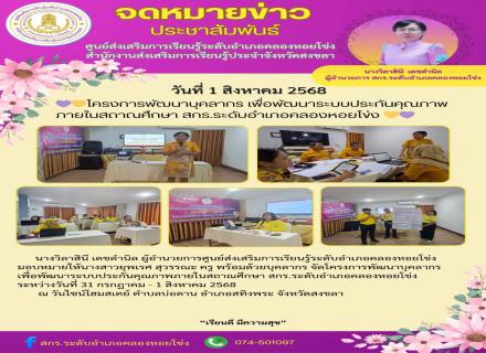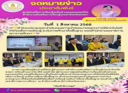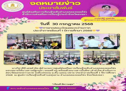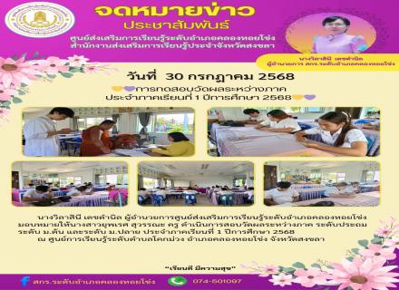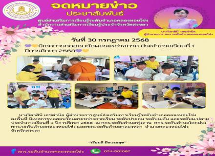 วันที่ 30 กรกฎาคม 2568 นางวิลาสินี เดชดำนิล ผู้อำนวยการศูนย์ส่งเสริมการเรียนรู้ระดับอำเภอคลองหอยโข่ง มอบหมายให้นางสาวยุพเรศ สุวรรณะ ครู ดำเนินการสอบวัดผลระหว่างภาคเรียน ระดับประถม ระดับ ม.ต้น และระดับ ม.ปลาย ประจำภาคเรียนที่ 1 ปีการศึกษา 256 |