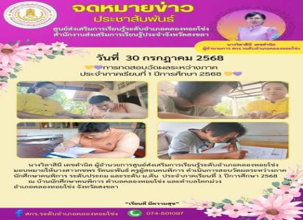 วันที่ 30 กรกฎาคม 2568 นางวิลาสินี เดชดำนิล ผู้อำนวยการศูนย์ส่งเสริมการเรียนรู้ระดับอำเภอคลองหอยโข่งมอบหมายให้นางสาวณัฐกฤตา จอมศรี ครู พร้อมด้วยนางสาวกันติชา ดำอำไพ ครูศูนย์การเรียนรู้ ดำเนินการสอบวัดผลระหว่างภาค ระดับประถม ม.ต้น และม.ปลาย ประจำภ |
