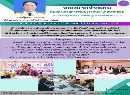 วันที่ 17 ตุลาคม 2567 นางสาวพัชรี ไชยโรจน์ ผู้อำนวยการศูนย์ส่งเสริมการเรียนรู้ระดับอำเภอเทพา #เข้าร่วมประชุมคณะทำงานโครงการพัฒนาการขับเคลื่อนการแก้ไขปัญหาเยาวชน NEETs (Youth Not in Employment,Education or Training) ระดับอำเภอ ครั้งที่ 2/2567 ณ ห้องประช |