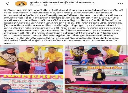9 กันยายน 2567 นายวิเชียร โชติช่วง ผู้อำนวยการศูนย์ส่งเสริมการเรียนรู้ระดับอำเภอจะนะ มอบหมายให้บุคลากรครู ศกร.ระดับตำบลสะกอม (อ.จะนะ) ดำเนินโครงการขับเคลื่อนศูนย์พัฒนาทักษะภาษาเพื่อการสื่อสารตำบลสะกอม ซึ่งมีวัตถุประสงค์เพื่อขับเคลื่อนศูนย์พัฒนาทักษะภาษาเพ |