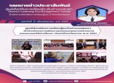 วันที่ 9 กันยายน 2567 ศูนย์ส่งเสริมการเรียนรู้อำเภอสะเดา นำโดย นางโสเพ็ญ ย้อยอัด ผู้อำนวยการ สกร.ระดับอำเภอสะเดา พร้อมด้วย นางเสาวรส หนูหยำ ครูชำนาญการ นางปริยากร เพชรมรกฏ และนางสาวจิตประภา ทองแกมแก้ว ครูกศน.ตำบล เข้าร่วมโครงการพัฒนาสมรรถนะบุคลากรด้านการแ