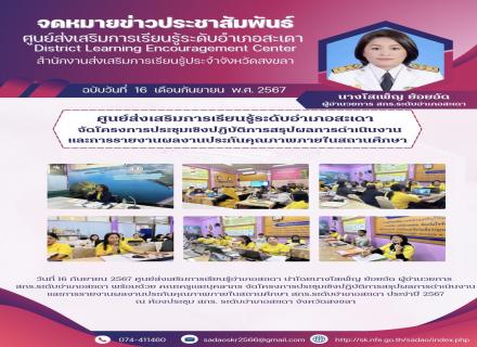 วันที่ 16 กันยายน 2567 ศูนย์ส่งเสริมการเรียนรู้อำเภอสะเดา นำโดยนางโสเพ็ญ ย้อยอัด ผู้อำนวยการ สกร.ระดับอำเภอสะเดา พร้อมด้วย คณะครูและบุคลากร จัดโครงการประชุมเชิงปฏิบัติการสรุปผลการดำเนินงานและการรายงานผลงานประกันคุณภาพภายในสถานศึกษา สกร.ระดับอำเภอสะเดา ปร