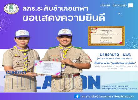 ศูนย์ส่งเสริมการเรียนรู้ระดับอำเภอเทพา ขอแสดงความยินดีกับนายอาบาวี มะสะ ระดับมัธยมศึกษาตอนปลาย 🏆ที่ได้รับรางวัล🎖️ #ลูกเสือจิตอาสาดีเด่น ในงานชุมนุมลูกเสือจิตอาสา สกร.จังหวัดชายแดนภาคใต้ ประจำปี พ.ศ. 2567 ระหว่างวั |