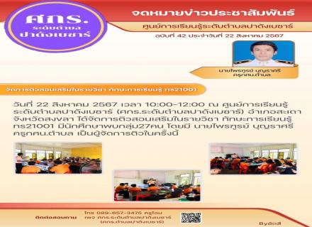 วันที่ 28 สิงหาคม 2567 นางสาวยุพเรศ สุวรรณะ ตำแหน่ง ครู คศ.2 รักษาการในตำแหน่ง ผู้อำนวยการ สกร.ระดับอำเภอคลองหอยโข่ง มอบหมายให้ นางสาวกชพร รัตนะพันธ์ ตำแหน่งครูผู้สอนคนพิการ จัดกิจกรรมการเรียนรู้ รายวิชาภาษาไทย (พท11001) ชั้นประถมศึกษา เรื่อง วรรณคดีแ |