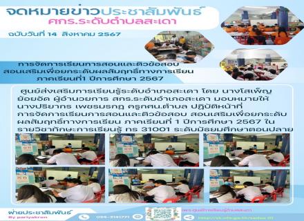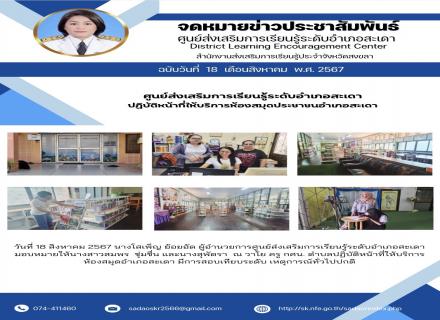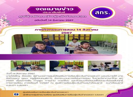 วันที่ 17-18 สิงหาคม 2567 นายวิเชียร โชติช่วง ผู้อำนวยการศูนย์ส่งเสริมการเรียนรู้ระดับอำเภอจะนะ มอบหมายให้นางสาวซีตีฟาตีเมาะ จึเลาะ ตำแหน่งครูผู้ช่วย ดำเนินการจัดสอบเทียบระดับการศึกษามิติความรู้ ความคิด ครั้งที่ 1 ปีการศึกษา 2567 โดยสนามสอบ สกร. ระดับอำเภ |