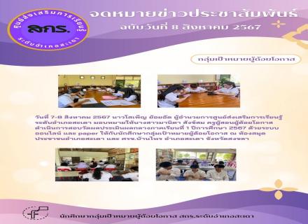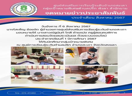 วันที่ 6 สิงหาคม 2567 นางโสเพ็ญ ย้อยอัด ผู้อำนวยการศูนย์ส่งเสริมการเรียนรู้ระดับอำเภอสะเดา มอบหมายให้นางสาวกัญญารัตน์ ทองวิลัย ครูผู้สอนผู้ด้อยโอกาส ดำเนินการสอบวัดผลประเมินผลกลางภาคเรียนที่ 1 ปีการศึกษา 2567 ระดับประถมศึกษา ด้วยระบบออนไลน์ ณ ศกร