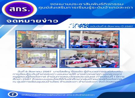 วันที่ 7 สิงหาคม 2567 นางโสเพ็ญ ย้อยอัด ผู้อำนวยการศูนย์ส่งเสริมการเรียนรู้ระดับอำเภอสะเดา มอบหมายให้ครูผู้สอน ดำเนินการสอบวัดผลประเมินผลกลางภาคเรียนที่ 1 ปีการศึกษา 2567 ระดับประถมศึกษา มัธยมศึกษาตอนต้น และมัธยมศึกษาตอนปลาย ด้วยระบบออนไลน์ และ paper