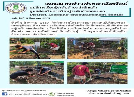 วันที่ 8 สิงหาคม 2567 จัดกิจกรรมโครงการขยายผลศูนย์ปรัชญาของ เศรษฐกิจพอเพียง ศกร.ระดับตำบลสำนักแต้ว นักศึกษาร่วมกันจัดทำถอด หญ้าบริเวณแปลงผัก ปรับหน้าดิน ภายในแปลงในแกลบและมูลสัตว์ ลง ต้นกล้า ณศกร.ระดับตำบลสำนักแต้ว หมู่ 1 บ้านหูนบ ตำบลสำนักแต้ว อำเภอสะเดา