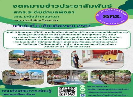 วันที่ 8 สิงหาคม 2567 นางโสเพ็ญ ย้อยอัด ผู้อำนวยการศูนย์ส่งเสริมการ เรียนรู้ระดับอำเภอสะเดา มอบหมายให้ นางสุพัตรา ณ วาโย ครู กศน.ตำบล ดำเนินการจัดกิจกรรมพัฒนาคุณภาพชีวิต (กพช.) โครงการจิตอาสาทำควาดีด้วยหัวใจ ทำความสะอาด วัดสืบสุข (วัดโคกศักดิ์) ให้กับนักศ