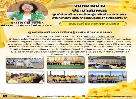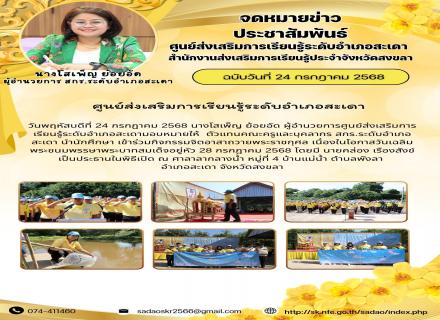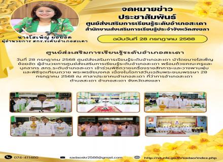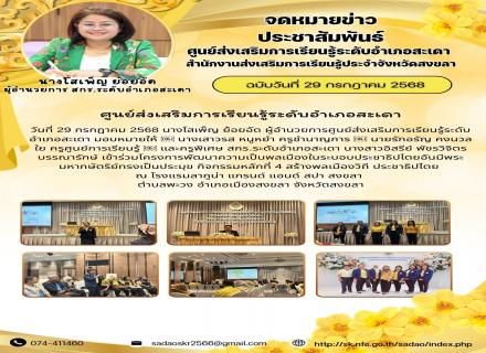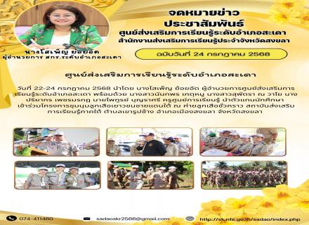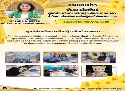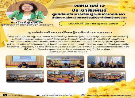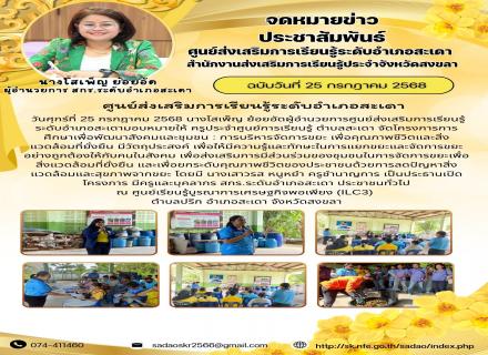 วันที่ 29 กรกฎาคม 2568 นางโสเพ็ญ ย้อยอัด ผู้อำนวยการศูนย์ส่งเสริมการเรียนรู้ระดับอำเภอสะเดา มอบหมายให้  นางเสาวรส หนูหยำ ครูชำนาญการ  นายรักอรัญ คงนวลใย ครูศูนย์การเรียนรู้  และครูพิเศษ สกร.ระดับอำเภอสะเดา นางสาวอิสรีย์