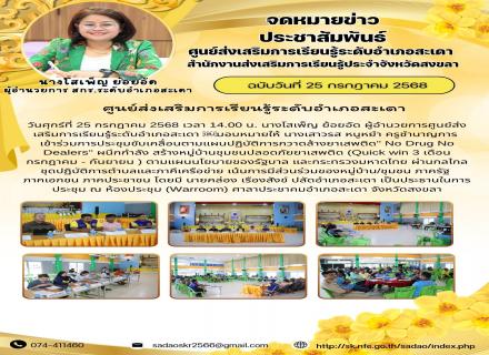 วันศุกร์ที่ 25 กรกฎาคม 2568 เวลา 14.00 น. นางโสเพ็ญ ย้อยอัด ผู้อำนวยการศูนย์ส่งเสริมการเรียนรู้ระดับอำเภอสะเดา มอบหมายให้ นางเสาวรส หนูหยำ ครูชำนาญการ เข้าร่วมการประชุมขับเคลื่อนตามแผนปฏิบัติการกวาดล้างยาเสพติด\" No Drug No Dealers\"