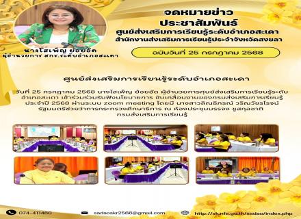 วันที่ 25 กรกฎาคม 2568 นางโสเพ็ญ ย้อยอัด ผู้อำนวยการศุนย์ส่งเสริมการเรียนรู้ระดับอำเภอสะเดา เข้าร่วมร่วมรับฟังนโยบายการ ขับเคลื่อนงานของกรมส่งเสริมการเรียนรู้ประจำปี 2568 ผ่านระบบ zoom meeting โดยมี นางสาวลิณธิภรณ์ วริณวัชรโรจน์ รัฐมนตรีช่วยว่าการกระทรวงศ