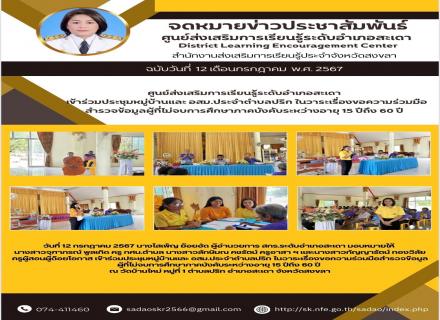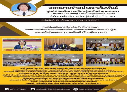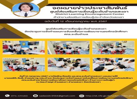 วันที่ 15 กรกฎาคม 2567 นางโสเพ็ญ ย้อยอัด ผอ.สกร.ระดับอำเภอสะเดา พร้อมบุคลากร ดำเนินการจัดโครงการพัฒนาศักยภาพองค์กรนักศึกษา ด้านภาวะความเป็นผู้นำ สกร.ระดับอำเภอสะเดา ภาคเรียนที่ 1 ปีการศึกษา 2567 โดยมีวัตถุประสงค์เพื่อขับเคลื่อนองค์กรนักศึกษาให้เป็นศูนย์ |