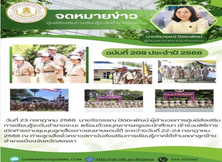 วันที่ 23 กรกฎาคม 2568 นางจีรวรรณ ปัตตะพัฒน์ ผู้อำนวยการศูนย์ส่งเสริมการเรียนรู้ระดับอำเภอจะนะ พร้อมด้วยบุคลากรครูและนีกศึกษา เข้าร่วมพิธีการเปิดค่ายงานชุมนุมลูกเสือเยาวชนชายแดนใต้ ระหว่างวันที่ 22-24 กรกฎาคม 2568 ณ ค่ายลูกเสือชั่วคราวสถาบันส่งเสริมการเรี |