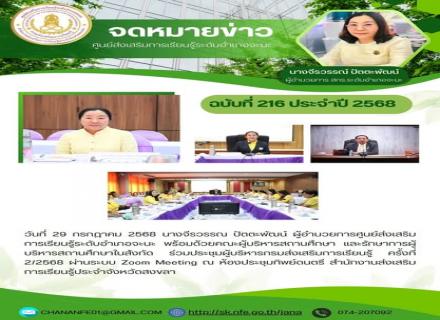 วันที่ 29 กรกฎาคม 2568 นางจีรวรรณ ปัตตะพัฒน์ ผู้อำนวยการศูนย์ส่งเสริมการเรียนรู้ระดับอำเภอจะนะ พร้อมด้วยคณะผู้บริหารสถานศึกษา และรักษาการผู้บริหารสถานศึกษาในสังกัด ร่วมประชุมผู้บริหารกรมส่งเสริมการเรียนรู้ ครั้งที่ 2/2568 ผ่านระบบ Zoom Meeting |