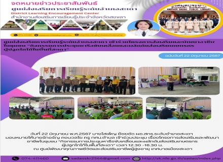 วันที่ 22 มิถุนายน 2567 ดร.ไพโรจน์ คเชนทองสุวรรณ์ ผู้อำนวยการ สกร.ระดับอำเภอหาดใหญ่ พร้อมด้วย คณะครู ศกร.ระดับตำบลหาดใหญ่ เข้าร่วมโครงการ พิมพ์ผ้า พิมพ์ใจ ด้วยใบไม้ สร้างรายได้ สร้างอาชีพ ซึ่งในโครงการมีการส่งมอบโครงการจาก อาสาสมัครทีทีบี เป |