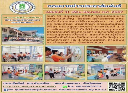 วันที่ 11 มิถุนายน 2567 ได้รับมอบหมาย จากนางโสเพ็ญ ย้อยอัด ผู้อำนวยการ สกร. ระดับอำเภอสะเดาให้นางสุพัตรา ณ วาโย ครู กศน.ตำบล นำนักศึกษา ศกร.ระดับตำบล พังลา ตรวจสุขภาพประจำภาพเรียนที่ 1 ปี การศึกษา 2567 ซึ่งได้รับความอนุเคราะห์ จากเจ้าหน้าที่ รพ.สต.พังลา ใ |