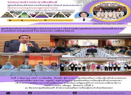 วันที่ 6 มิถุนายน 2567 ดร.ไพโรจน์ คเชนทองสุวรรณ์ ผู้อำนวยการ สกร.ระดับอำเภอหาดใหญ่ มอบหมายให้ นายสญชัย กาญจนเพ็ญ นางสาวหร่อมะ บิลนุ้ย ครูอาสาสมัครฯ และ นางชุติมณฑน์ จันทร์ทอง ครู ศกร.ระดับตำบลพะตง เข้าร่วมโครงการบูรณาการความร่วมมือของทุกภาคส่วน กิจกรรมที่ |