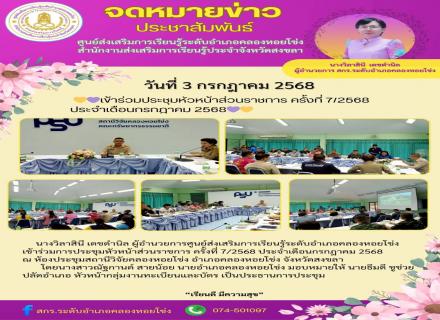 วันที่ 3 กรกฎาคม 2568 นางวิลาสินี เดชดำนิล ผู้อำนวยการศูนย์ส่งเสริมการเรียนรู้ระดับอำเภอคลองหอยโข่ง เข้าร่วมการประชุมหัวหน้าส่วนราชการ ครั้งที่ 7/2568 ประจำเดือนกรกฎาคม 2568 ณ ห้องประชุมสถานีวิจัยคลองหอยโข่ง อำเภอคลองหอยโข่ง จังหวัดสงขลา โดยนาง |