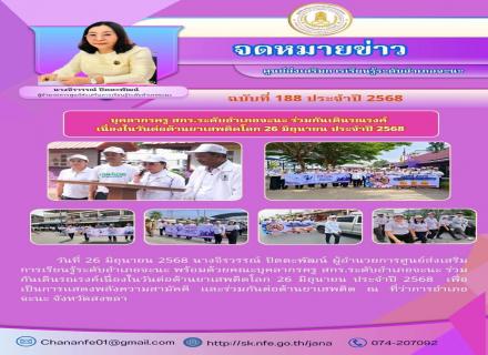 วันต่อต้านยาเสพติดโลก วันที่ 26 มิถุนายน 2568 นางจีรวรรณ์ ปัตตะพัฒน์ ผู้อำนวยการศูนย์ส่งเสริมการเรียนรู้ระดับอำเภอจะนะ พร้อมด้วยคณะบุคลากรครู นักศึกษาสกร.ระดับอำเภอจะนะและประชาชนในอำเภอจะนะ ร่วมกันเดินรณรงค์ เนื่องในวันต่อต้านยาเสพติดโลก 26 มิถุนายน ประจ |