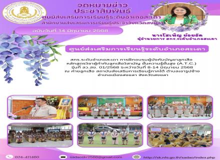สกร.ระดับอำเภอสะเดา การฝึกอบรมผู้บังคับบัญชาลูกเสือ หลักสูตรวิชาผู้กำกับลูกเสือวิสามัญ ขั้นความรู้ชั้นสูง (A.T.C.) รุ่นที่ ลว.สข. 01/2568 ระหว่างวันที่ 8-14 มิถุนายน 2568 ณ ค่ายลูกเสือ สถาบันส่งเสริมการเรียนรู้ภาคใต้ ตำบลเขารูปช้าง อำเภอเมืองสงขลา จังหวัด