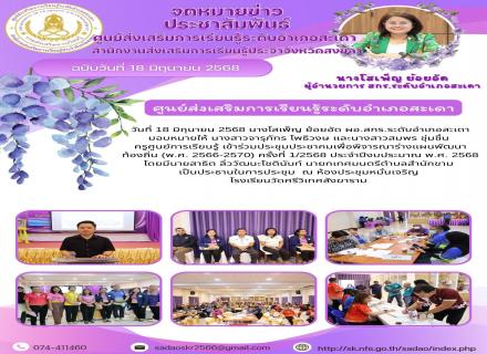 วันที่ 18 มิถุนายน 2568 นางโสเพ็ญ ย้อยอัด ผอ.สกร.ระดับอำเภอสะเดา มอบหมายให้ นางสาวจารุภัทร โพธิวงษ และนางสาวสมพร ชุ่มชื่น ครูศูนย์การเรียนรู้ เข้าร่วมประชุมประชาคมเพื่อพิจารณาร่างแผนพัฒนา ท้องถิ่น (พ.ศ. 2566-2570) ครั้งที่ 1/2568 ประจำปีงบประมาณ พ.ศ. 256