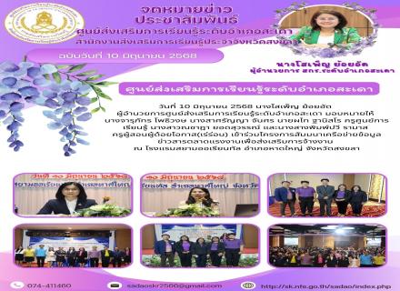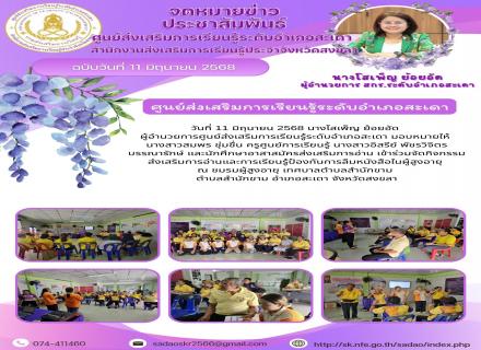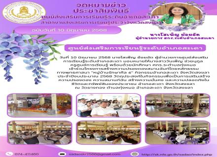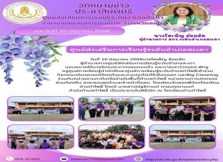 วันที่ 20 มิถุนายน 2568 ดร.ไพโรจน์ คเชนทองสุวรรณ์ ผู้อำนวยการศูนย์ส่งเสริมการเรียนรู้ระดับอำเภอหาดใหญ่ มอบหมายให้ นางอมรพันธ์ ทองแก้ว ครูศูนย์การเรียนชุมชน ดำเนินกิจกรรมพบกลุ่มนักศึกษา ณ ศรช.สกร.ระดับอำเภอหาดใหญ่ |