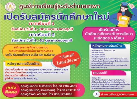 ศูนย์การเรียนรู้ระดับตำบลเทพา รับสมัครนักศึึกษาใหม่ ภาคเรียนที่ 2 ปีการศึกษา 2568 ระดับ ประถมศึกษา มัธยมศึกษาตอนต่น มัธยมศึกษาตอนปลาย และนักศึกษาเทียบระดับการศึกษา สนใจ ติดค่อสอบถามได้ที่ ศกร.ระดับตำบลเทพา อำเภอเทพา จังหวัดสงขลา